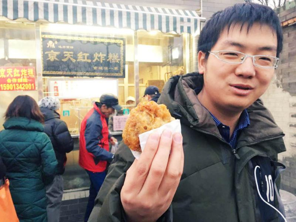 京天红的炸糕起步于1993年,最初只是为了增加饭馆人气开设了窗口,起初生意一般。至1994 年窗口短暂停业时,厨师发现略微发酵的江米面炸出炸糕,口感味道更好。经员工品尝、老顾 客品尝,这种做法逐渐定型并保留下来。2008年前后开始在南城流行,常见排队购买的人们, 高峰时间要排一个小时的队。