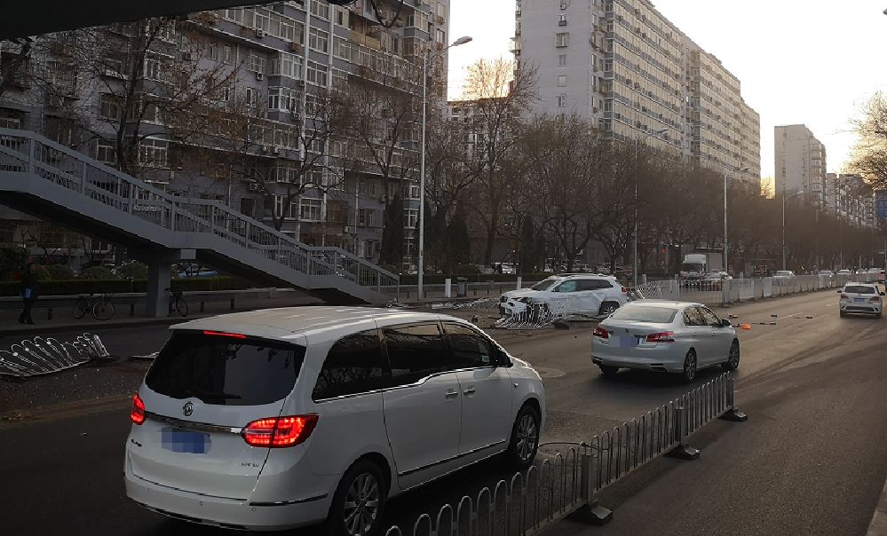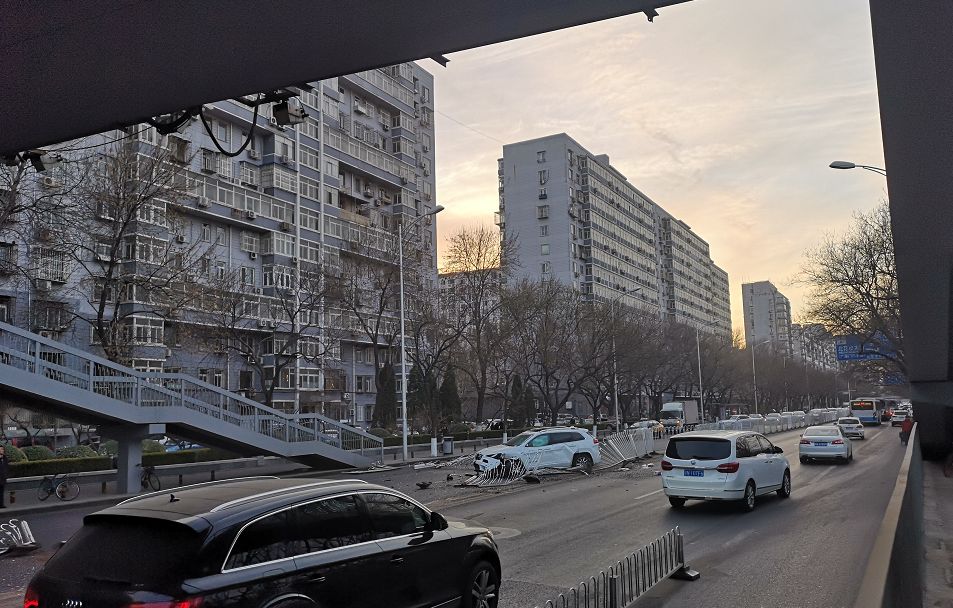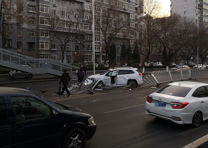 19日17时许,位于东便门桥以西的崇文门东大街发生一起车祸,一白色越野车由东向西驶下东便门桥后发生事故,剐倒护栏后停在路中央。巨大的冲击力使得护栏扭曲变形,碎片满地。事故发生后,白色越野车驾驶员走下车,搀扶着两名乘客来到路边休息。