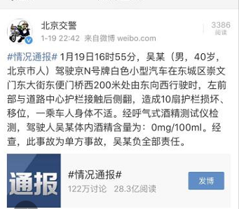 @北京交警当晚发布情况通报:1月19日16时55分,吴某(男,40岁,北京市人)驾驶京N号牌白色小型汽车在东城区崇文门东大街东便门桥西200米处由东向西行驶时,左前部与道路中心护栏接触后侧翻,造成10扇护栏损坏、移位,一乘车人身体不适。经呼气式酒精测试仪检测,驾驶人吴某体内酒精含量为:0mg/100ml。经查,此事故为单方事故,吴某负全部责任。