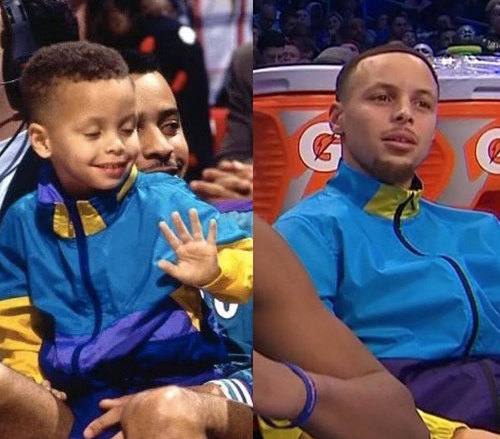 由于今年全明星赛是在库里父亲曾经效力的夏洛特黄蜂队主场进行,因此现场播放了27年前库里父亲带着只有4岁的库里观看比赛的视频,细心的球迷立马发现,今天库里是穿着与27年前同款的外套!