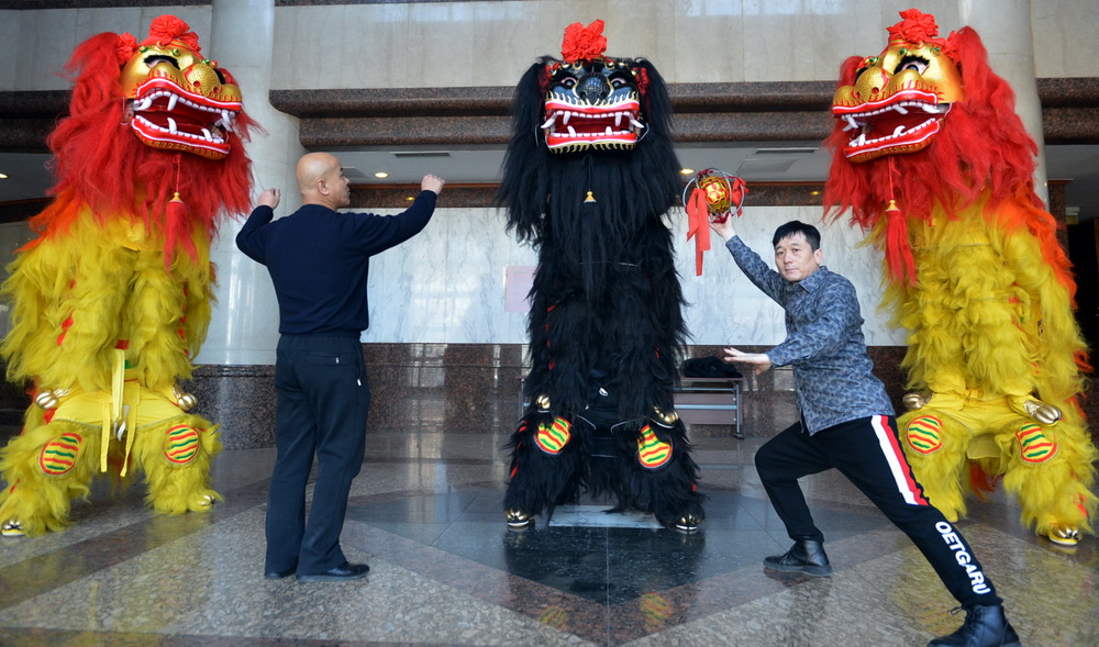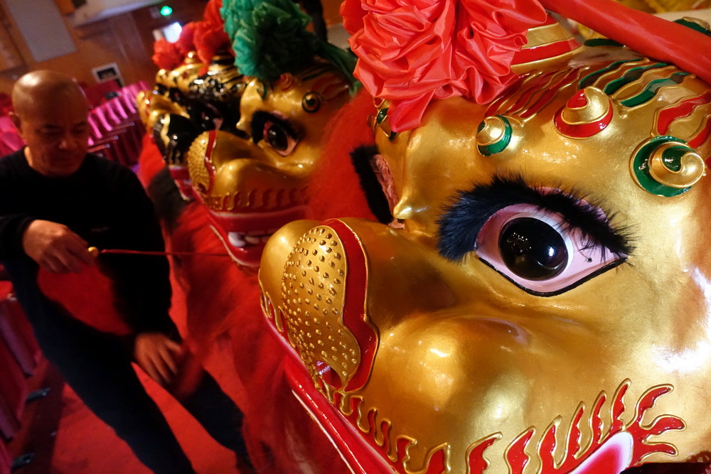 表演前,杨敬伟挨个检查狮头,确保现场表演效果和安全。