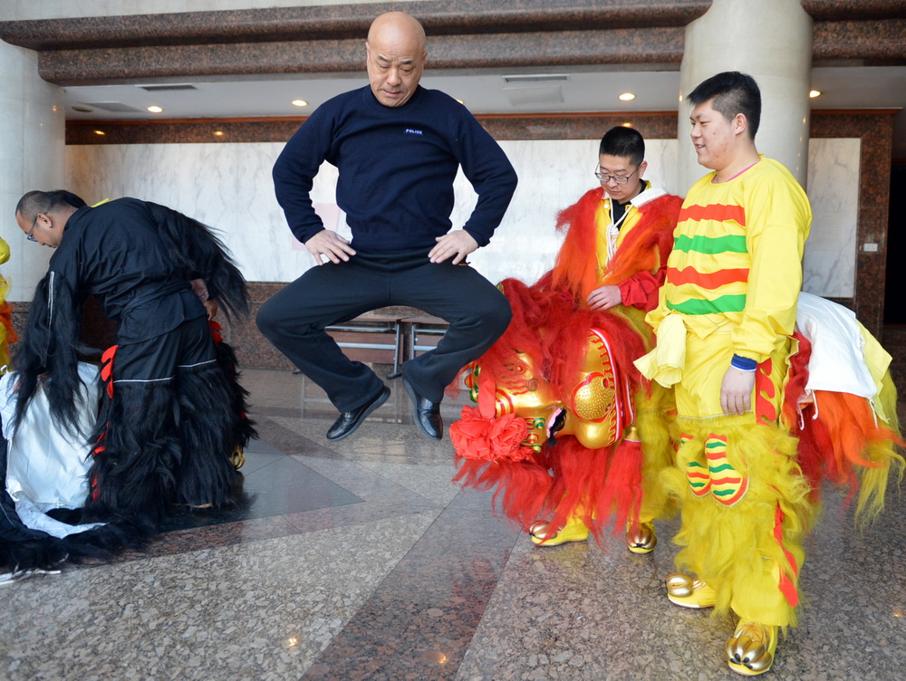 “白纸坊,两头翘,狮子、胯鼓、莲花落。”这句京城俗语中的狮子,说的就是白纸坊太狮。今天上午,白纸坊太狮队的队员们也正加紧做着最后的合排,为晚上在石景山游乐园正月十五庙会的表演做最后准备。