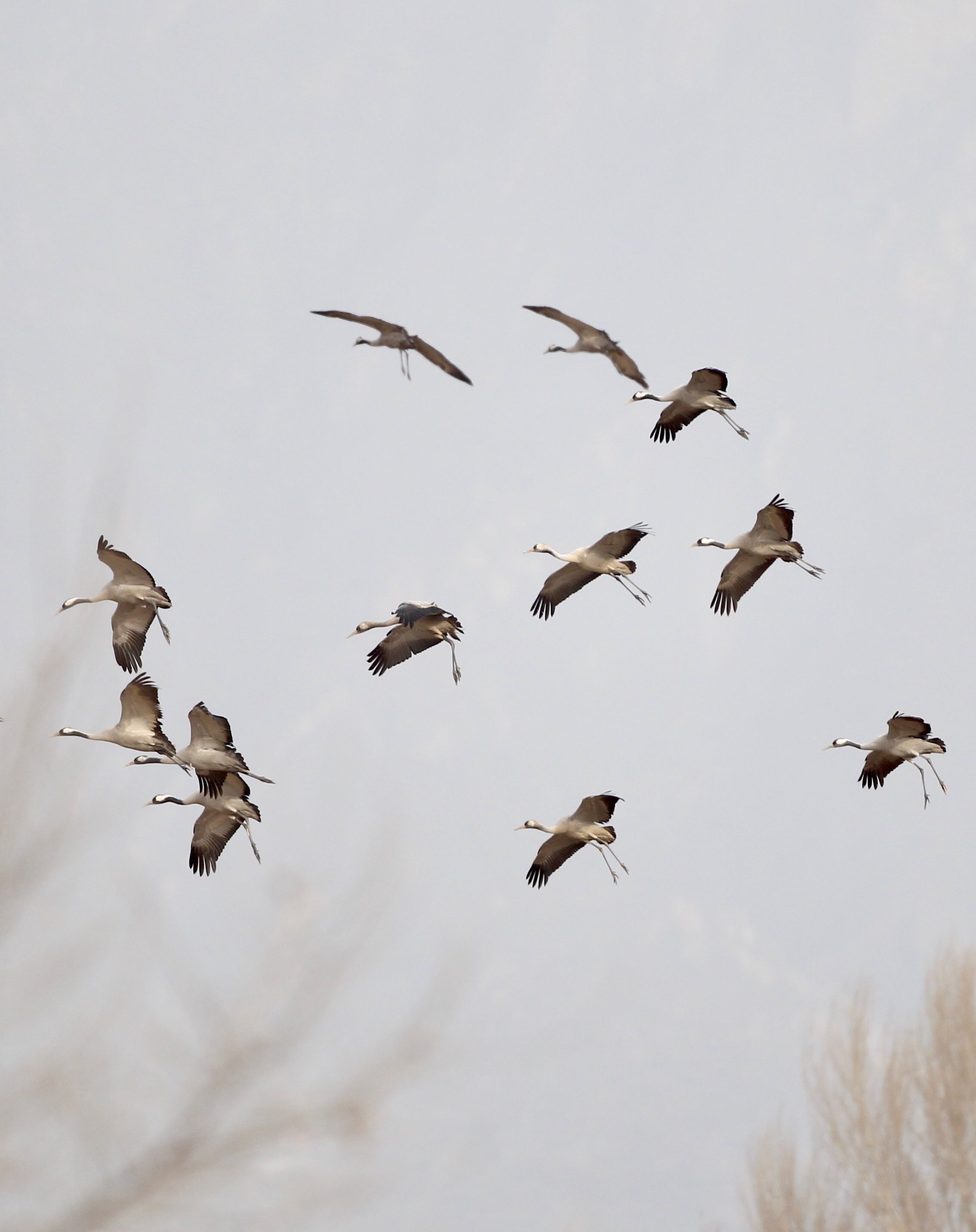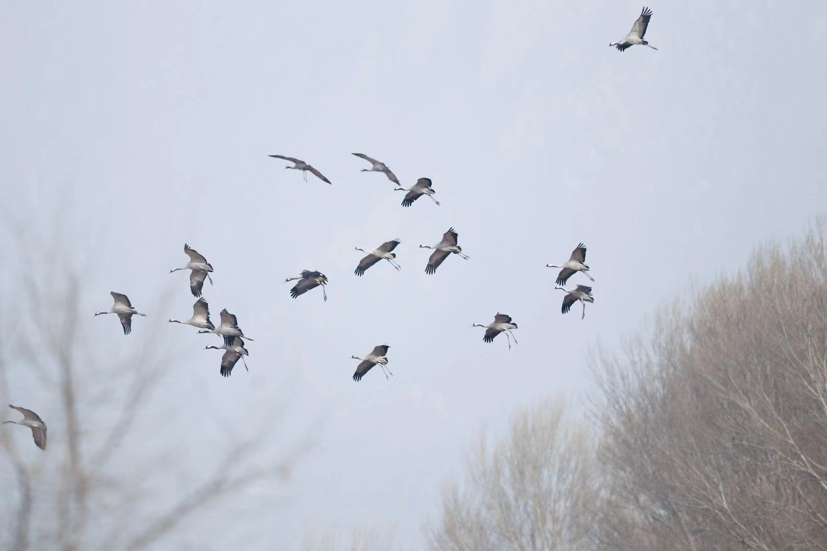 这两天新加入的灰鹤,有可能是从江苏盐城、江西鄱阳湖等南方省市的湿地保护区飞来,在一段时间的食物补给后,将继续北飞,至蒙古等地繁殖。