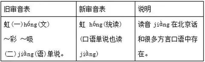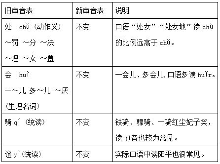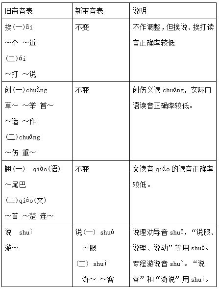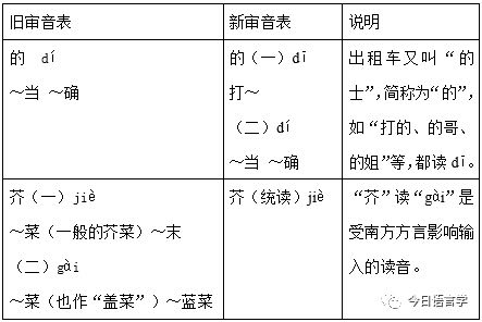 2016年普通话异读词审音表(修订稿)中部分读音新旧对比图,图片来自中国社会科学院语言研究所公众号“今日语言学”。