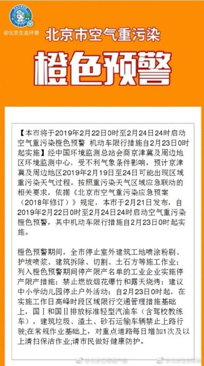 经中国环境监测总站会商京津冀及周边地区环境监测中心,受不利气象条件影响,预计京津冀及周边地区2019年2月19日至24日可能出现区域重污染天气过程。按照重污染天气区域应急联动的相关要求,依据《北京市空气重污染应急预案(2018年修订)》规定,本市于2月21日发布,自2019年2月22日0时至2月24日24时启动空气重污染橙色预警,其中机动车限行措施自2月23日0时起实施。