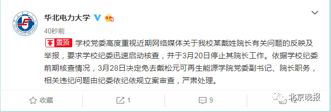 学校党委高度重视近期网络媒体关于我校某戴姓院长有关问题的反映及举报,要求学校纪委迅速启动核查,并于3月20日停止其院长工作。依据学校纪委前期核查情况,3月28日决定免去戴松元可再生能源学院党委副书记、院长职务,相关违纪问题由纪委依纪依规立案审查,严肃处理。