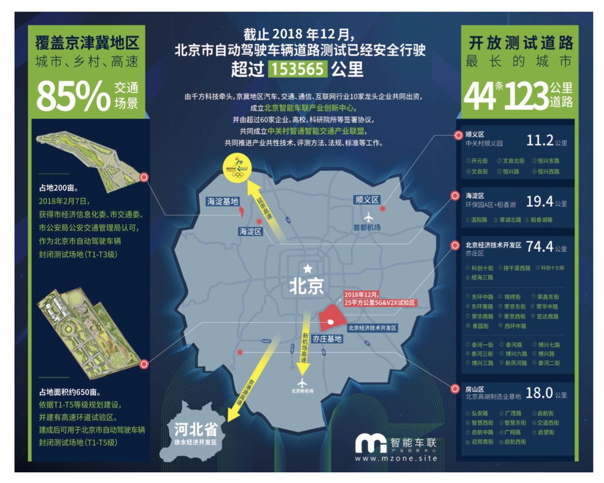 目前,北京建设了国家智能汽车与智慧交通(京冀)示范区海淀基地、东方时尚驾校大兴基地两个自动驾驶封闭训练测试场。在北京经济技术开发区、海淀区、顺义区、房山区四个区域,开放了44条道路、共计123公里自动驾驶测试道路,覆盖了多样化的城市交通场景,开放道路总里程处于全国领先地位。