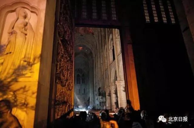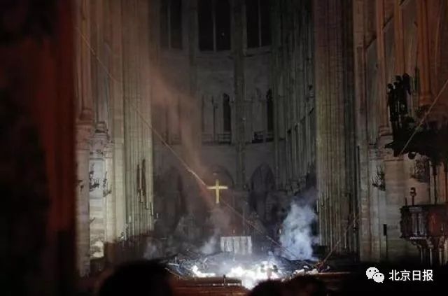 马克龙说,在巴黎各界、特别是500名消防员的奋力扑救下,巴黎圣母院的两个钟楼和正面建筑得到挽救,但三分之二的屋顶已被大火损毁,特别是标志性的塔尖已经倒塌。