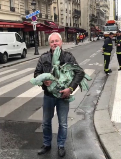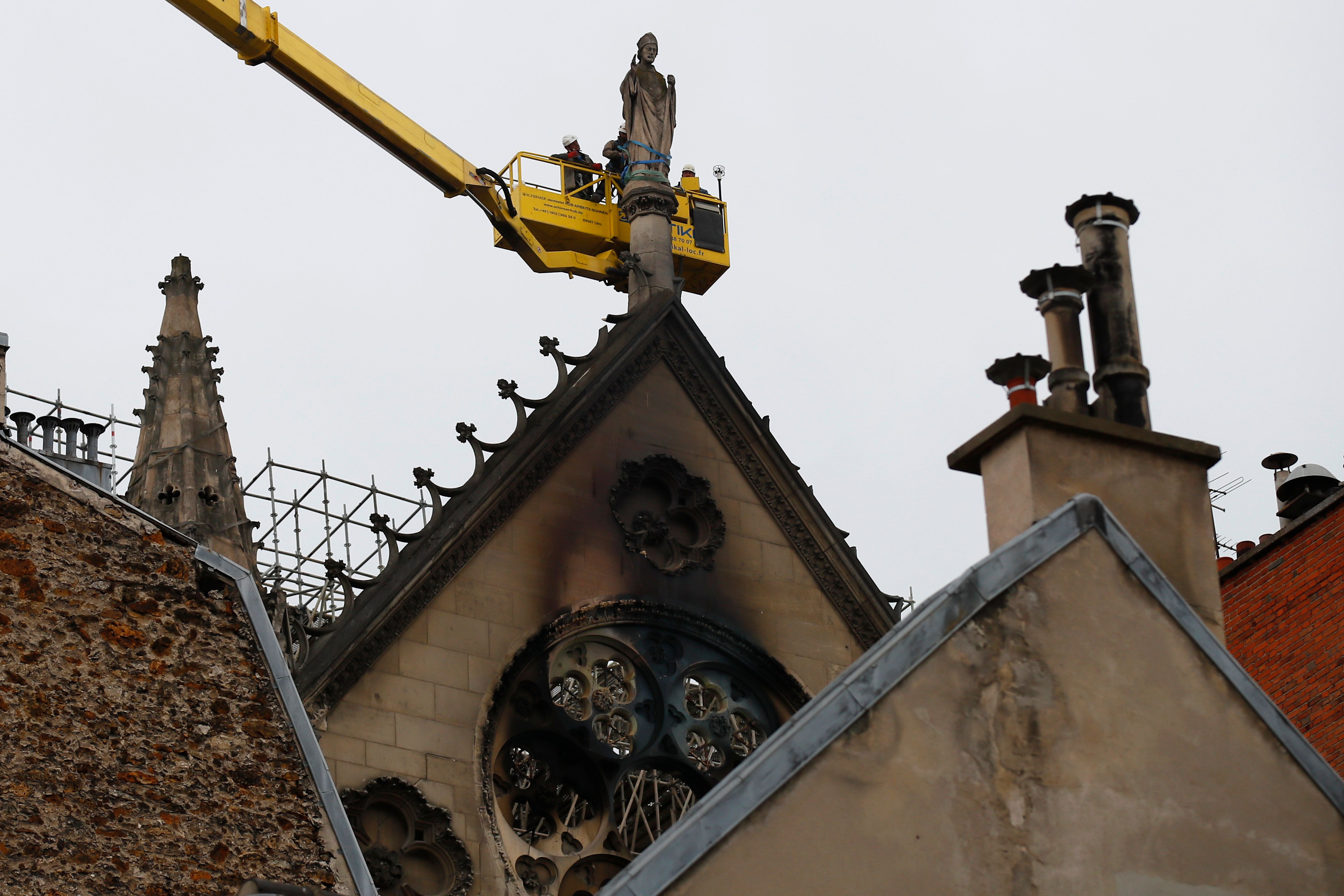 火灾过后,工作人员抢救巴黎圣母院顶上的雕像。图片来源:东方IC