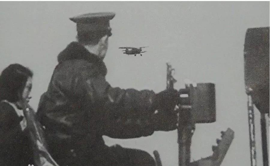 这张珍贵的黑白照片,略显模糊,一架深黑色双翼飞机,凌空飞过,振翅翱翔。