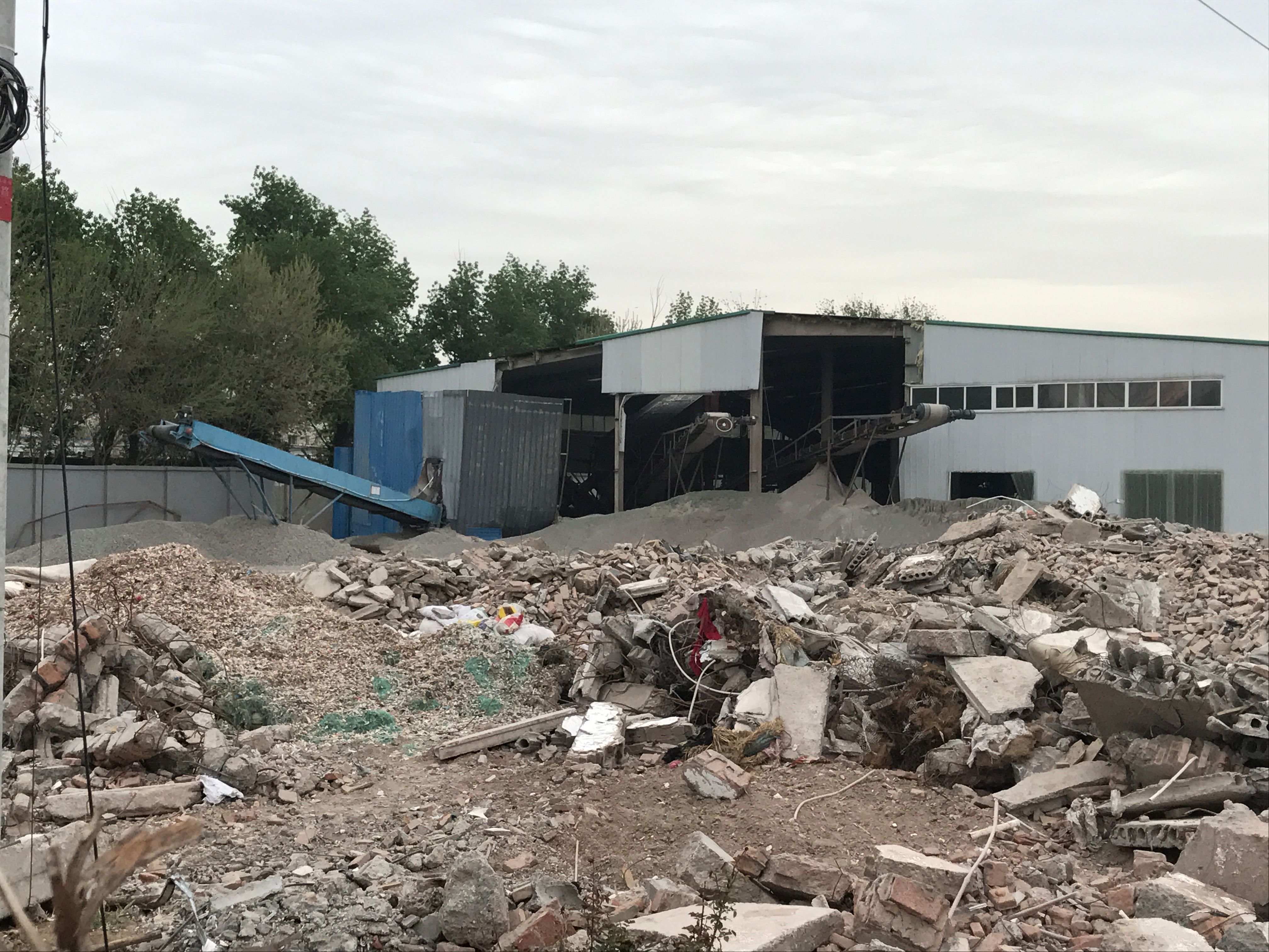记者跟守门的工作人员提出想进场看看,被他拦住了。为了进一步了解场区渣土堆的情况,记者顺着渣土场大门旁的围墙往北走了几十米,来到一处堆放电线杆的路边空地,踩着路边堆放的石材爬到了墙头上。眼前呈现的景象非常震撼,目光所及之处是一片占地面积巨大的建筑垃圾堆放场,各种建筑垃圾堆满了场区,在靠近北侧的场区,是一间白色厂房,里面有几台大型机械,两个巨大的机械臂从厂房里伸出来,机械臂的滚轴上卷着一条长长的皮带。厂房里面没有人,也听不到机械工作的声音,在机械臂下面堆着成片被加工成颗粒状的砂石。