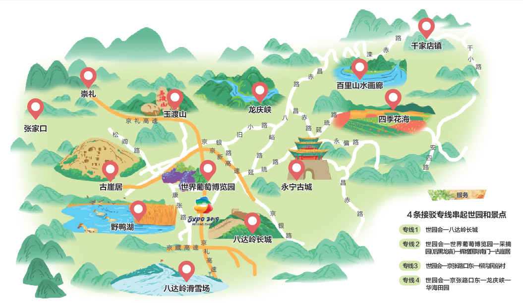 如今,为迎接世界园艺盛会,延庆以园区为核心,联动长城、古崖居、永宁古城、百里山水画廊等独具特色的景点和精品民宿,推出八大主题22条精品旅游线路,本报记者为游客精选了12条线路。