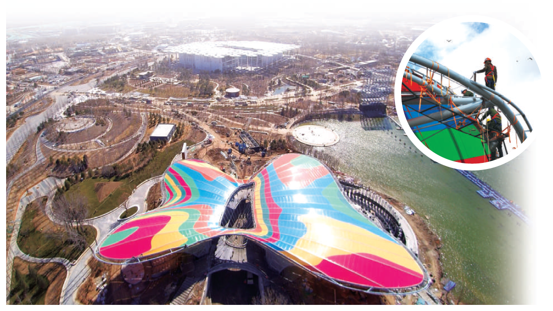 从开工建设,到竣工验收,国际馆的建设历经寒冬酷暑。冬天零下十几度的严寒中,再抗冻的衣服都抵挡不住无孔不入的寒冷;夏天热辣辣的阳光暴晒下,钢结构上的温度足以烤熟鸡蛋。在艰苦的环境中,北京建工的建设者充分发扬工匠精神、铁军精神,最终实现“花伞花海”在妫水河畔惊艳亮相。