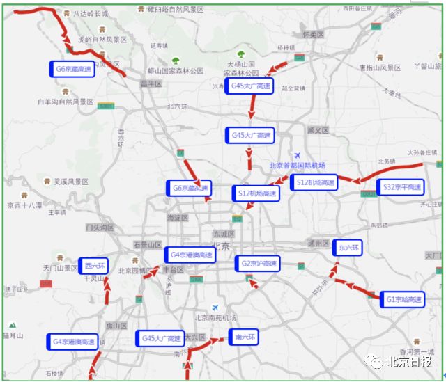 此外,京藏高速康庄收费站、辛庄桥至西三旗、上清桥也是常规拥堵点段,由京藏高速返程的司机在进入六环之后,可以绕行京新高速。