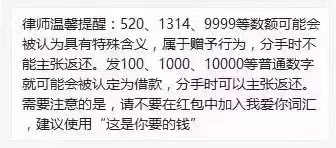 今天520,微信发红包、转账成为人们表达爱意的流行方式。同时,一张名为“律师温馨提醒”的图片也开始在朋友圈流传,大意是,情侣间发520、1314、9999等特殊金额属于赠与,分手时要不回,但是发100、1000、10000等普通数额则属于借款分手时能要回。