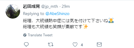 岩田成晃:首相和总统都要注意别中暑啊。两人笑得都好好看