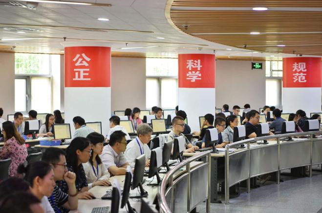 正式评卷前,各学科工作组会组织各科小组长以上负责人集中学习研究《答案评分标准》。同时,全体评卷教师要进行上岗前业务培训,经过实操性考试合格后才能正式上岗,防止评卷过程中出现偏宽、偏严或宽严不一的现象。各科目均为“背靠背双评”,如双评超过阈值的在进行三评或四评,对经过三评或四评的试卷,都要全部进行再次核查,另外每天还进行一定量抽检。