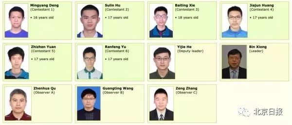 今年的中国队由邓明扬(高一,中国人民大学附属中学)、胡苏麟(高二,华南师范大学附属中学)、袁祉祯(高二,武钢三中)、俞然枫(高二,南京师范大学附属中学)、黄嘉俊(高一,上海中学)和谢柏庭(高三,浙江乐清知临中学)六名队员组成。