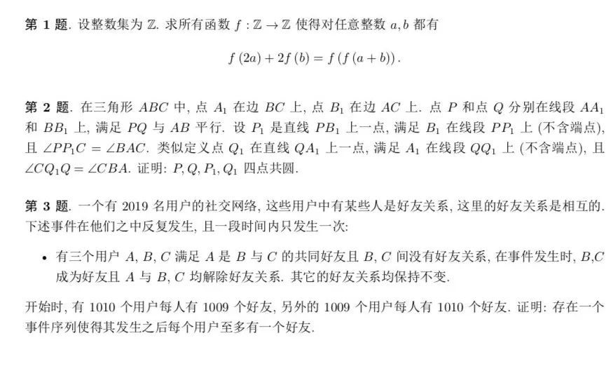 IMO竞赛分为两天,比赛题目共六题,每题满分7分,也就是个人满分为42分,由于一个队伍最多允许6人参赛,也就是说理论上的团体最高分可达到252分(历史上唯一一次252分是美国队于1994年获得)。今年的题目依次涉及:代数、几何、组合;数论、组合、几何。
