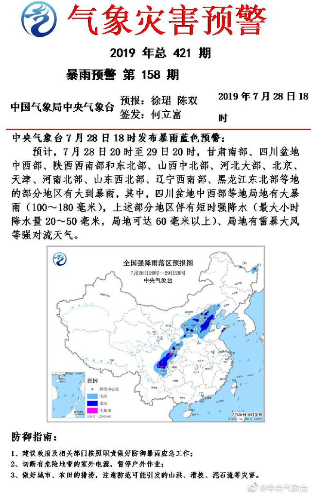 中央气象台发布暴雨蓝色预警,北京28日20时起将迎来短时强降雨、局地有雷暴大风等强对流天气。