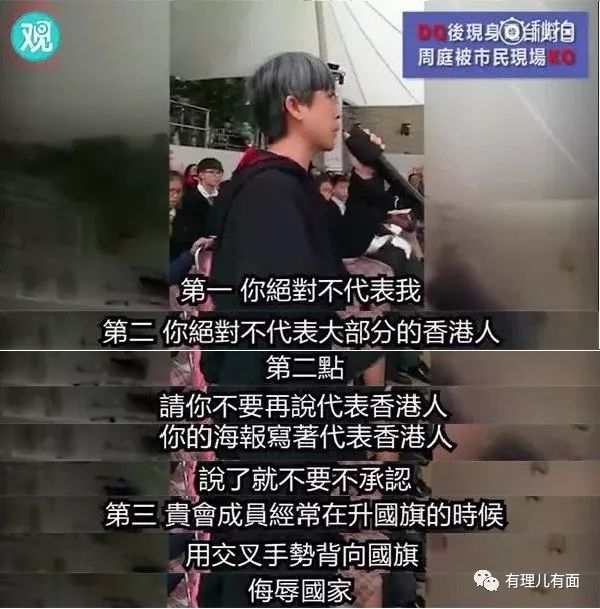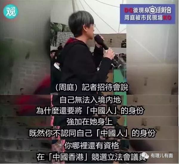 2018年1月,已被取消立法会议员参选资格的周庭在参加香港电台节目时,被现场一位女性市民当场质问,既然不认同自己“中国人”的身份,又何来资格在“中国香港”竞选立法会议员?同时,该市民请周庭今后不要再妄言“代表香港人”,因为她代表不了包括该市民在内的绝大部分香港人。周庭弱声反驳称“并没有要代表你”,又被霸气怼回:说了就不要不承认。