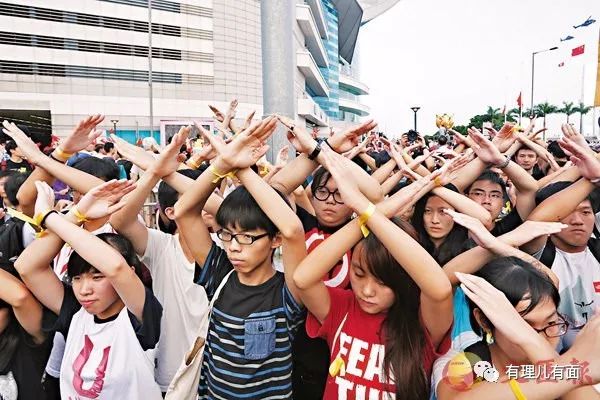 “港独”组织“香港众志”交叉手势背对国旗