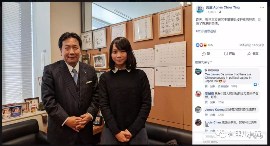 2018年1月8日,周庭在社交媒体自曝在东京与日本在野党“立宪民主党”党魁、曾诬称中国是日本的“亚洲恶邻”的反华政客枝野幸男会面,声称“讨论香港事情”。