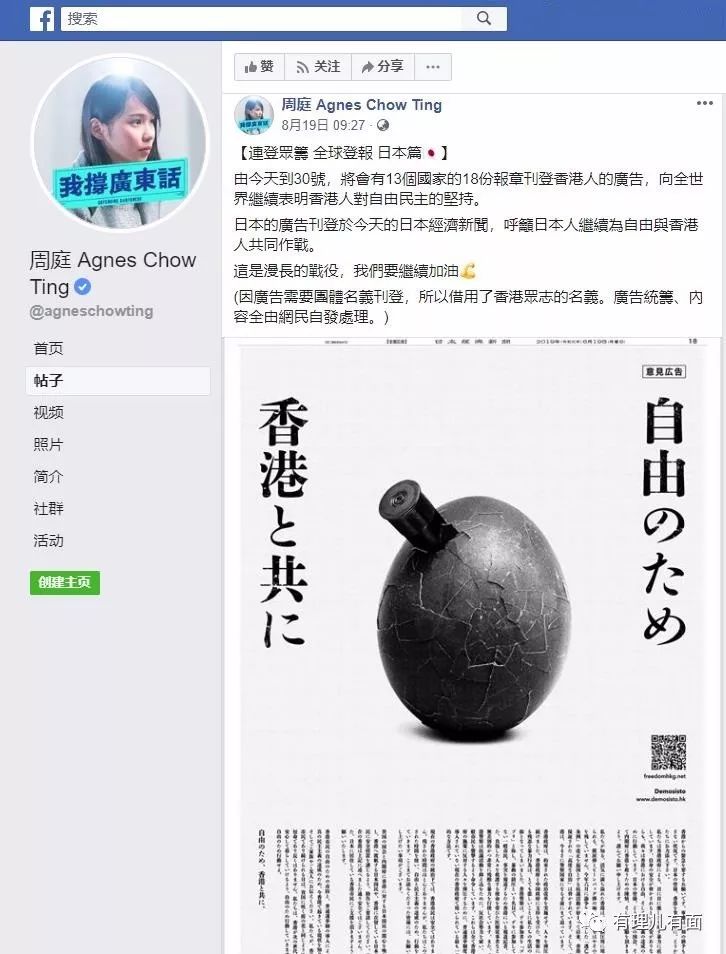 今年8月19日,周庭继续煽风点火,在社交媒体发帖宣称以“香港众志”组织名义在日本等国家的报刊上刊登关注香港“反修例”暴乱的广告,抹黑香港国际形象,借国际舆论制造负面影响。