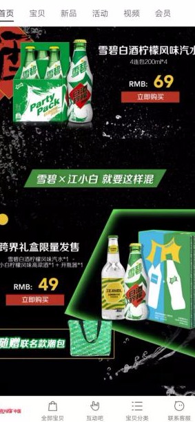 可口可乐天猫旗舰店中我们可以看到,雪碧与江小白联名款已经在可口可乐店铺首页发售,其中一款是雪碧白酒柠檬风味汽水,4瓶组合销售,目前的优惠价是69元,截至记者发稿前的月销量已突破3千。另一款产品则是江小白与雪碧联名限量礼盒,包含了一瓶300毫升装的江小白柠檬风味高粱酒与一瓶200毫升装的白酒风味雪碧、开瓶器以及随赠联名款潮包一个,目前优惠价格为49元,月销量已经接近2千。