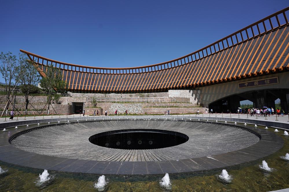 步入园区,中国馆映入眼帘。海坨山下,妫水河畔,一座外形如一柄如意的半环形建筑舒展于青山绿水间。这是一座会“呼吸”、有“生命”的绿色建筑。