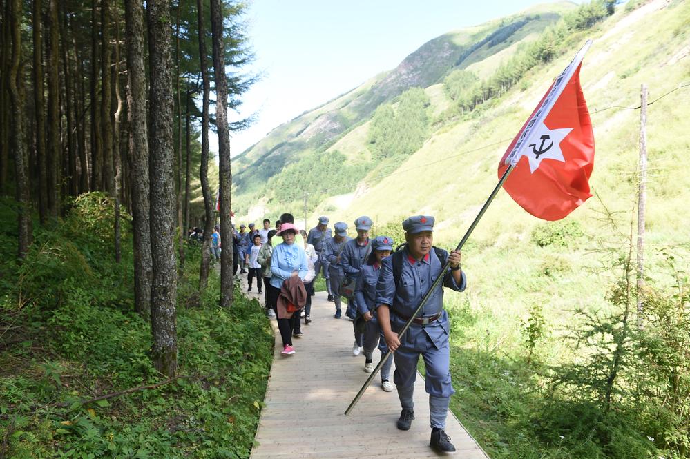 参加“记者再走长征路”活动的媒体记者在六盘山脚下的“红军小道”上进行体验式采访(2019年8月12日摄)。新华社记者 罗晓光 摄