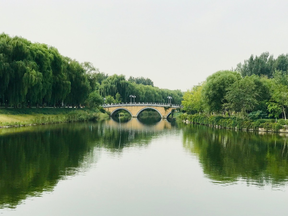 运河水面宽阔处,栽有大片的荷花。盛夏已过,花朵已不见踪影,但碧绿的荷叶犹在,不时可见白鹭在水面上飞过。