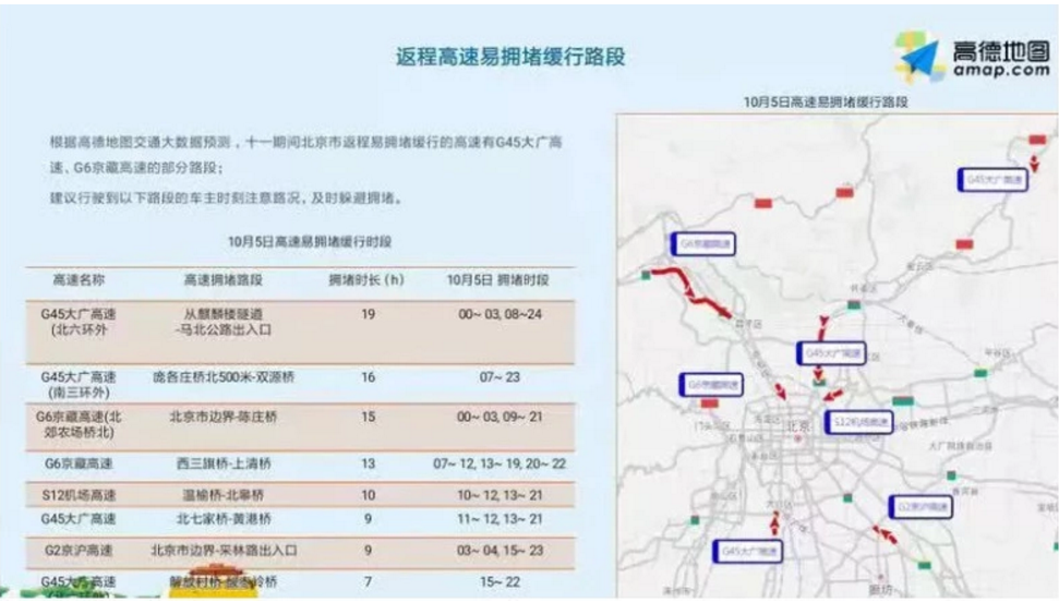 交通预报显示,大广高速、京港澳高速、京藏高速、京哈高速、京沪高速等高速的部分路段易出现拥堵缓行情况。预计9月30日22时起,京藏、京承、机场、大广、京港澳、京台、京沪等高速公路的出京车辆较平日会有大幅增加,部分高速主收费站(来广营、清河、榆垡等)或出现局部拥堵情况;10月1日、2日6时至12时,全市各条高速公路出京方向交通压力都较为突出,10月1日10时为国庆假期交通压力最大时点。