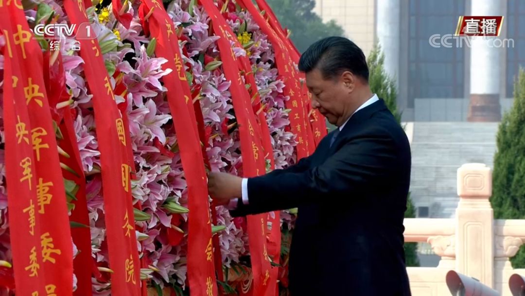 习近平等党和国家领导人,同4000多名各界代表一起出席向人民英雄敬献花篮仪式。在唱国歌、默哀等环节之后,习近平等党和国家领导人登上纪念碑基座,在花篮前驻足凝视。习近平迈步上前,仔细整理花篮缎带。