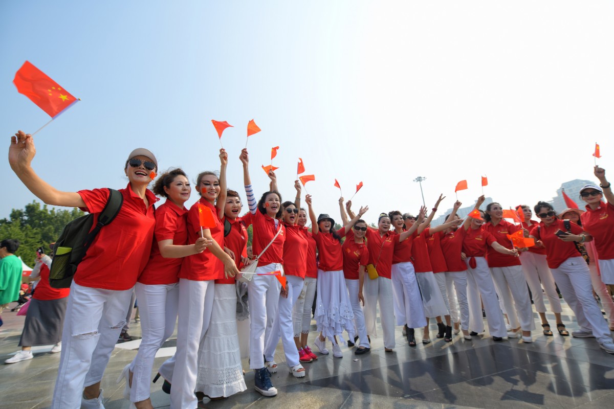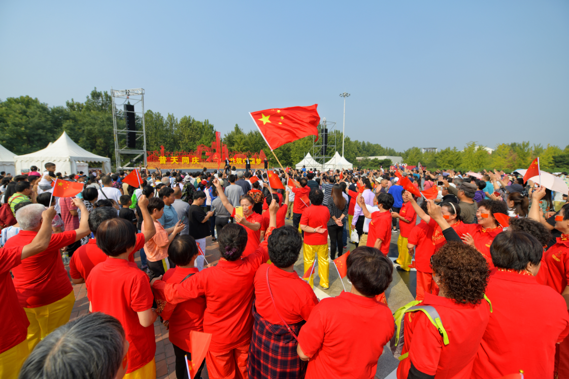 “来来来来我们唱起来,点赞美好新时代……”8位身着黄色演出服的阿姨随着音乐的节拍整齐地舞动着,在伞塔广场北侧,朝阳区街乡群众也纷纷亮出“绝活儿”来助兴。垡头街道带来了健身操《点赞新时代》,麦子店街道为观众们展示了健身气功《八段锦》。今天共有12支健身队伍参加展示,他们全部来自基层,以退休的老人为主。他们以阳光灿烂的笑容、整齐划一的动作、别具一格的队形变换传递了健康、快乐的精神,现场观众纷纷竖起大拇指为他们点赞。