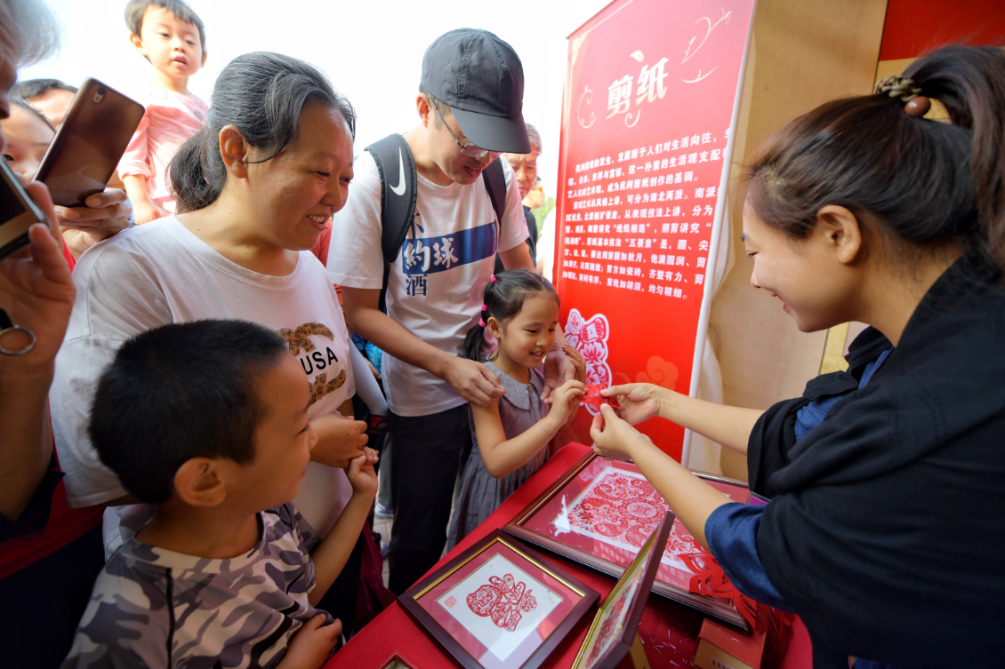 “动物身上细细的绒毛、锯齿状的花蕊都是可以用剪刀剪出来的。先剪出外轮廓,再从一边开始,左、右、左、右交叉地剪,就形成锯齿了。”在礼花广场东侧,剪纸艺术家董月娇正带着游客体验非遗剪纸的乐趣。安安今年6岁,他有模有样地学着,一步步完成了人生中第一幅剪纸作品。