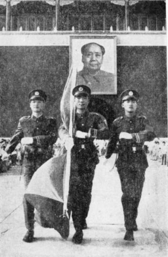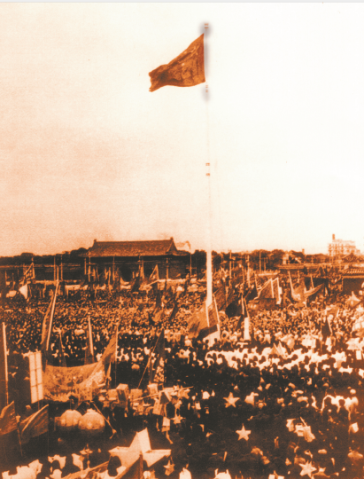 1949年10月1日,新中国成立天安门广场升起的第一面五星红旗。