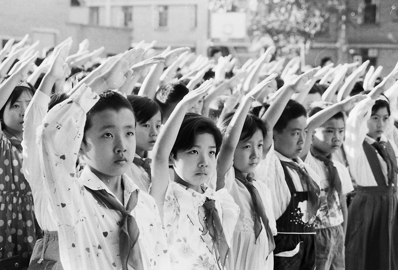 1989年,白家庄小学举行升旗仪式,少先队员向国旗敬队礼。叶用才/摄