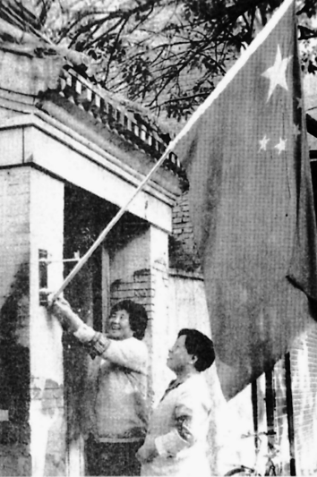 1997年,本市居民在家门口悬挂统一制作的国旗。刁立声/摄