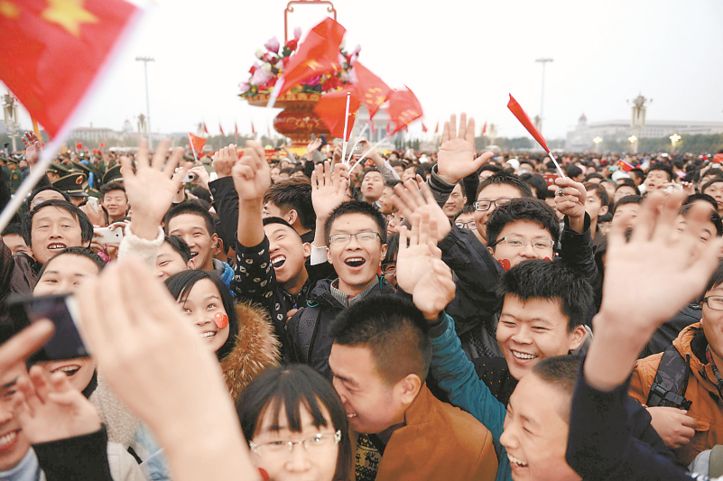 2014年10月1日,12万群众在天安门广场观看升旗仪式后,欢呼着表达喜悦之情。 和冠欣/摄