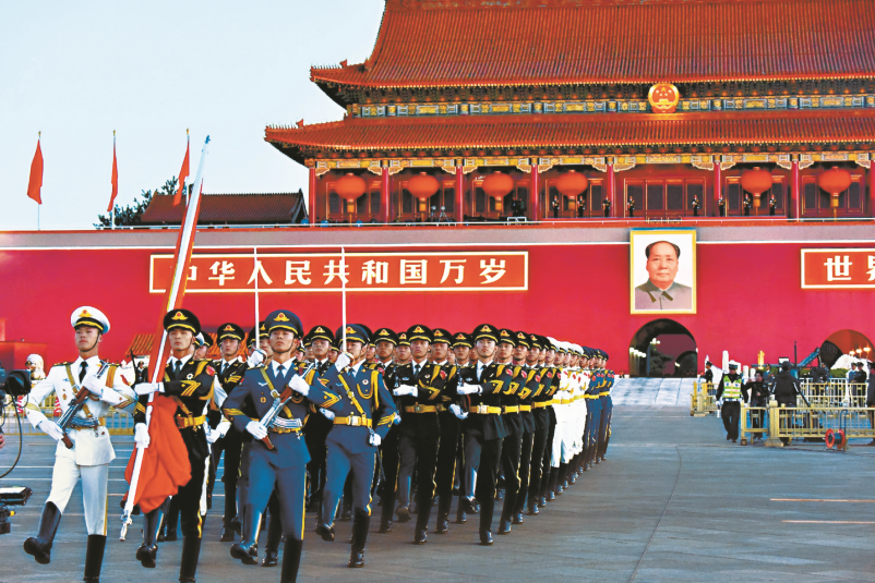 2018年,清晨,中国人民解放军三军仪仗队护旗队护卫着五星红旗从天安门城楼列队走出。和冠欣/摄