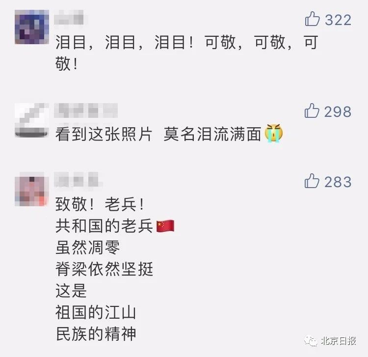 但这张照片,我们更看到我们与英雄、向民族栋梁的互动,这种无言的力量,让老兵泪目,更让我们泪目。”