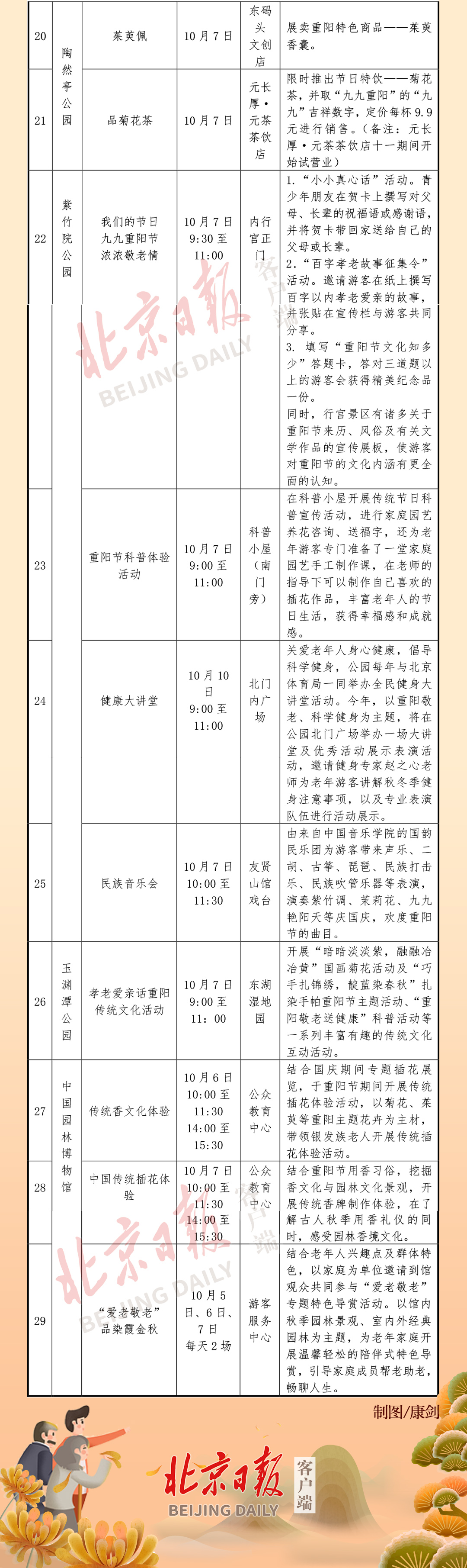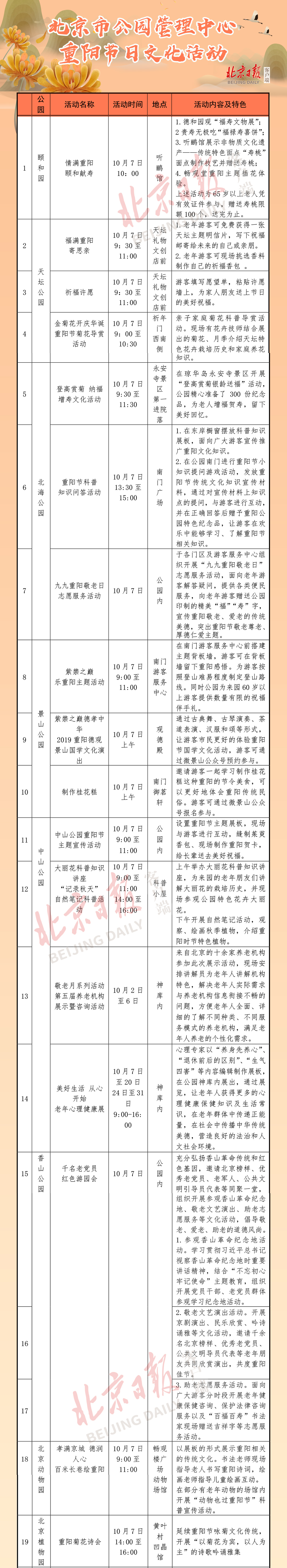 明天是国庆长假的最后一天,又恰逢重阳节,市属11家公园及中国园林博物馆将围绕“孝满京城德润人心”主题,突出尊老敬老、厚德仁爱的节日文化内涵,组织开展29项重阳游园活动,市民可入园参与。
