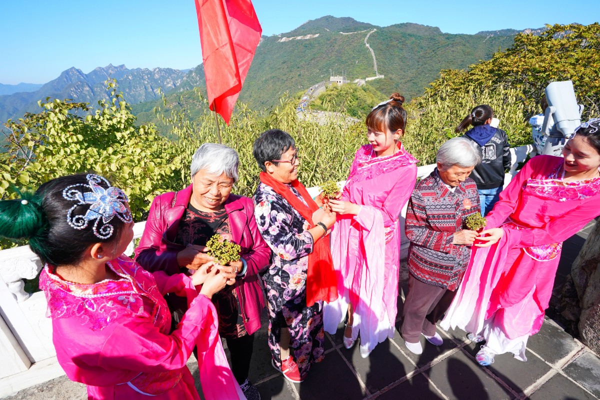 今天是国庆长假的最后一天,也正逢重阳佳节。重阳素有登高的习俗,上午,由怀柔区委宣传部、怀柔区文化和旅游局主办的“孝满京城 润德人心”2019年重阳节文艺专场演出就登上了慕田峪长城。湛蓝的晴空中偶有飞鸟掠过,四面青山峻岭环绕,蜿蜒的长城在望,舞台就设在长城的登城平台处。主办方还贴心地为大家准备了菊花茶、重阳糕和茱萸香囊。