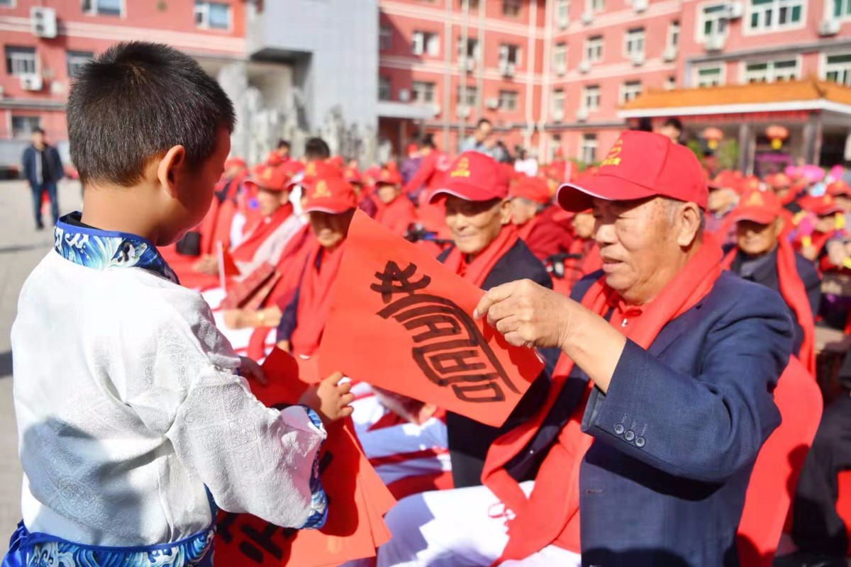 表演结束后,作为演出的特殊环节,来自北京第二实验小学平谷分校的20名学生,现场书写“福”字、“寿”字,为在座的老人们送“福”送“寿”,展示中国书法之乡青少年风采。