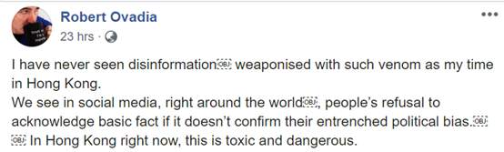 在Robert Ovadia发布在“脸谱网”(Facebook)的一篇贴文中,他一上来先是指出香港目前的氛围是“有毒”和“危险”的。