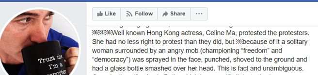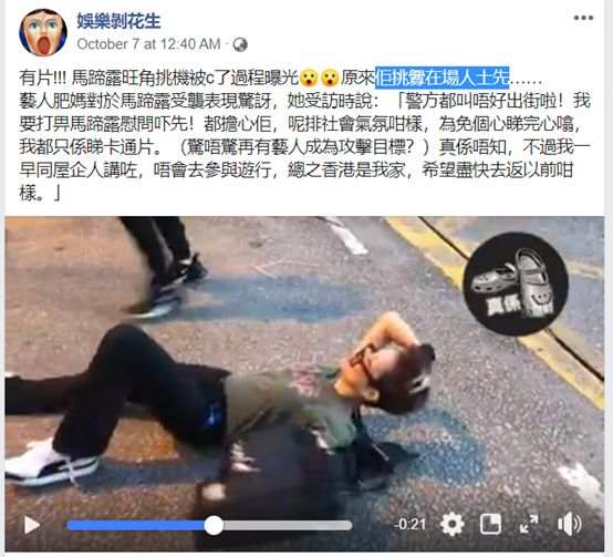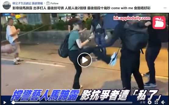 他说,在知名香港艺人马蹄露被打当天,他也在现场目的了全程。而他看到的是,马蹄露仅仅因为行使自己的权利,抗议了这些“示威者”,这名孤身一人的女子就遭到了满嘴“自由民主”的暴徒的袭击:她被喷了一脸辣椒粉,被殴打,然后被推到在地。