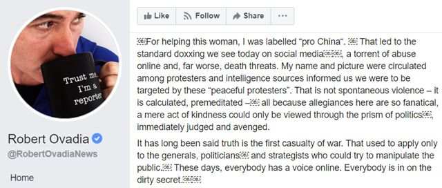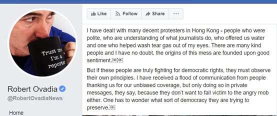 言归正传,在那篇“脸谱网”的贴文的最后,Robert Ovadia再次抨击了这些暴徒。他说他在香港也见过一些真正平和的示威者,但如果这个群体真想捍卫民主价值观,就必须检讨自己的行为和准则。