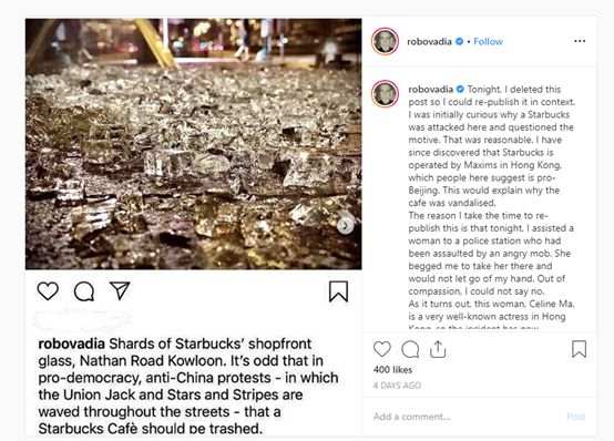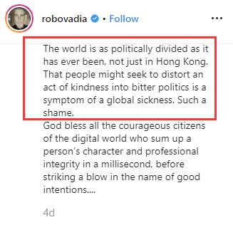 他还因此在自己的Instagram账号上发帖分享了一些感想,称“不仅是香港,现在全世界都在变得比以往还要政治分裂。而人们会将一个普通的善举进行苦涩的政治歪曲,便是这么一种全球化病症的体现。这太可耻了。”