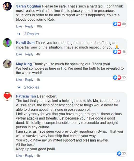 目前,在Robert Ovadia这篇“脸谱网”贴文的下面,不少留言者都向他表达了敬意,感谢他对于香港真实情况的报道,并提醒他多注意人身安全。